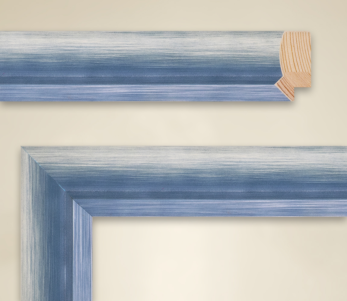 Himlen på jorden lovar nästan denna bildram Luana - en himmelsblå färgblandning på denna ram ger vidd och luftighet i rummet där den står på sin plats. Men även tavlan, fotografiet eller konsttrycket, vad som än ska ramas in med Luana, kommer förmodligen att sväva på moln med den här ramen. Den blågrå med silverkant har följande mått: 44 millimeter i bredd och 25 millimeter i höjd. Silvret appliceras på den vinklade remsan och tillsammans med himmelsblå randiga fästen utgör det slutresultatet på insidan av bildramen. En mörkblå färg sticker ut i spåret som symboliserar gränsen till den runda stången i det övre området. Därefter följer en rökig blå färg som blir ljusare och ljusare allt eftersom den fortskrider. En silvervit färg dominerar ramens övre kant. Blandningen av blå, silver och vita toner på ramen ger intryck av att Luana verkligen kan konkurrera med det verkliga konstverket, som om den hade applicerats med en konstnärs pensel. |