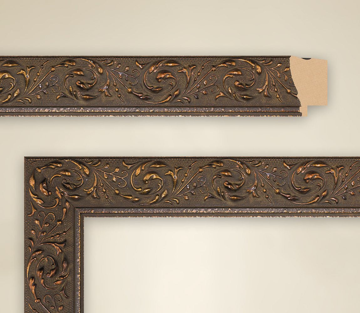 Med Minou-modellen presenterar Tapestry-ramserien en bronsram med ornament som är en enkel men ändå imponerande målarram, både när det gäller färg och form. Med sina 32 mm sticker ramen ut i rummet precis vid ytterkanten på sin högsta punkt. Dess totala bredd är 40 mm, där designerna har inkluderat totalt två områden. Den övre, tjocka bården med sina ornament tar upp större delen av den övre delen av bilden. Från väggen syns denna del av den äkta trädetaljen som en tunga som böjs uppåt och sedan planar ut i en svag vinkel mot botten. Underlaget har en matt designad, medelbrun bronsfärgad ton, med delvis ljusa nyanser som blinkar fram. Till detta, som till en början också hålls ganska i bakgrunden, hör små metallprickar som påminner om en koppargravyr och som sprider en underbar struktur. De har också fått en glänsande ljus bronsfärg, liksom de andra ornamenten som följer med dem. Här valde formgivarna blommiga element, som visar mycket filigrana rännor vars ändar här och där slutar i knoppar. Trots detta är de fortfarande mycket känsliga i sin helhet, eftersom mycket luft skickligt har lämnats mellan väven. För avslutningen till bildens inre finns en smal, enkel dubbelbalk. |