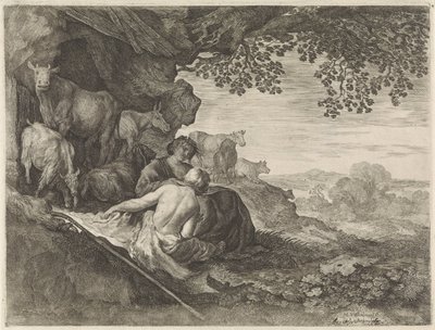 Herder en herderin schuilend voo...