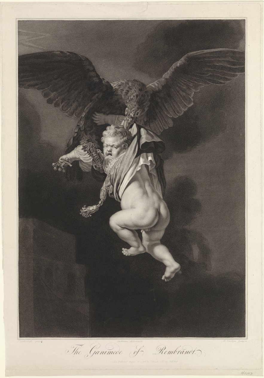 Jupiter och Ganymedes(Jupiter en Ganymedes)Antoine Cardon(print maker),Rembrandt van Rijn(after painting by),Jacob Seydelmann(after drawing by) |