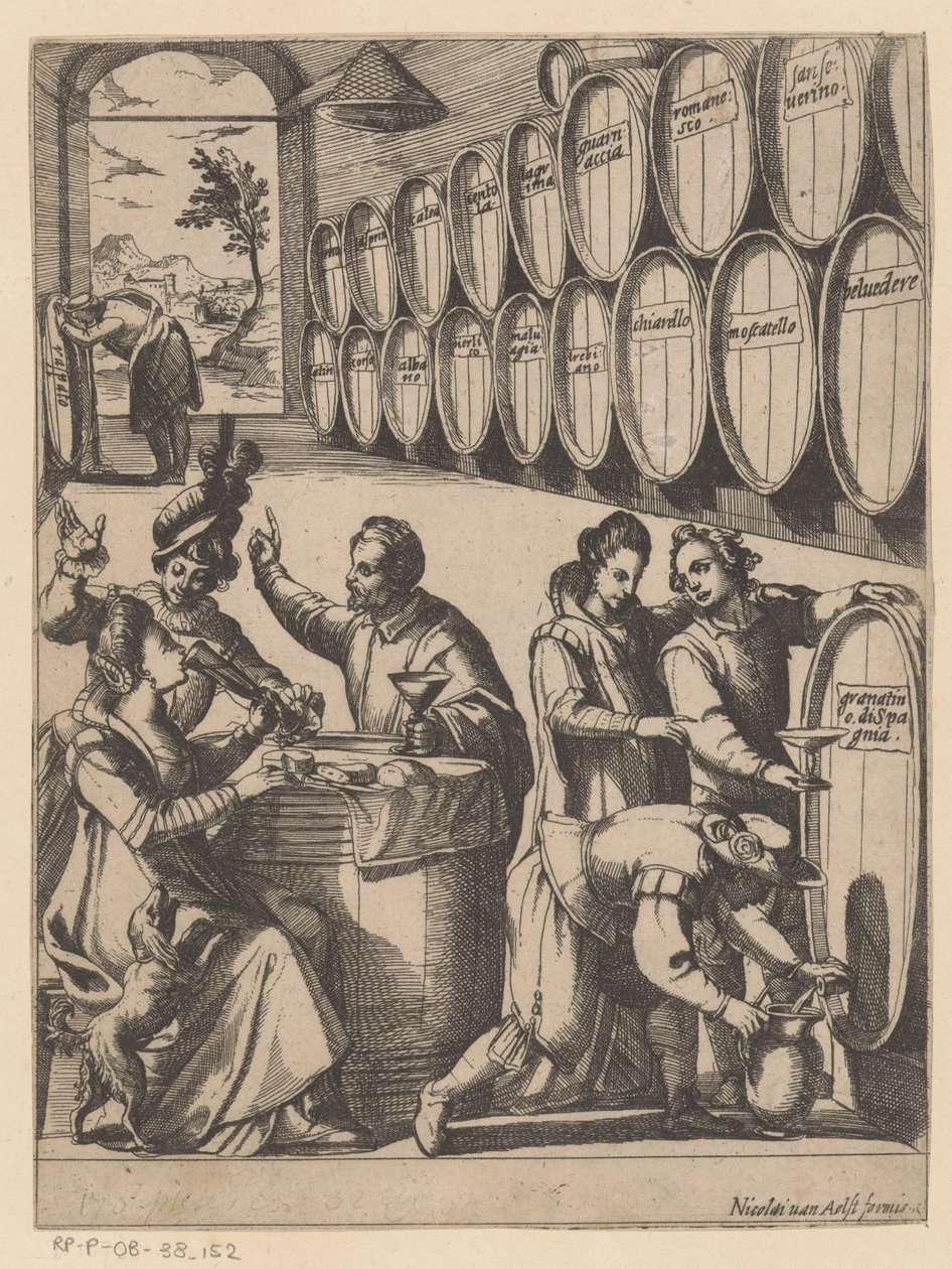 Drinkfest i vinkällaren(Drinkfestijn in wijnkelder)Antonio Tempesta(print maker),Nicolaus van Aelst(after design by) |