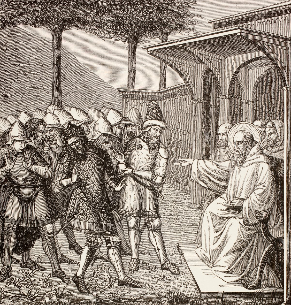 Ua faitioina e St Benedict o Nursia le Tupu o le Ostrogoths, c.1880 swed(St Benedict of Nursia reproaches the King of the Ostrogoths, c.1880 )English School |