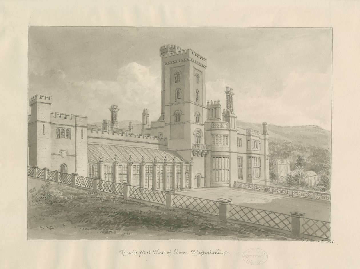 Ilam Hall: sepiateckning(Ilam Hall: sepia drawing)John Chessell Buckler |