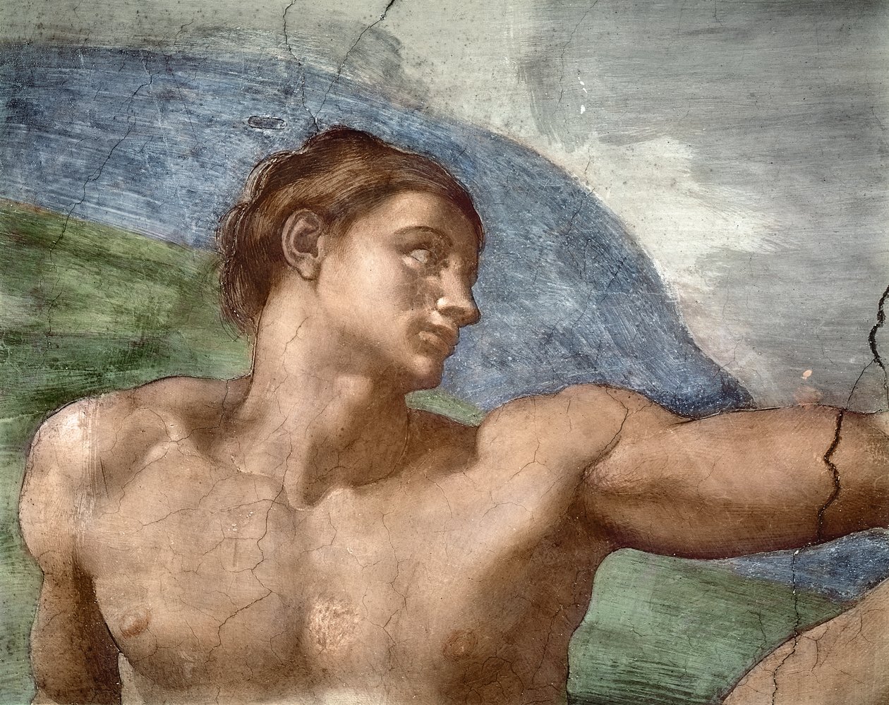 The Creation of Adam, detalj av Adams huvud, 1508-12(The Creation of Adam, detail of Adams head, 1508-12 )Michelangelo Buonarroti |